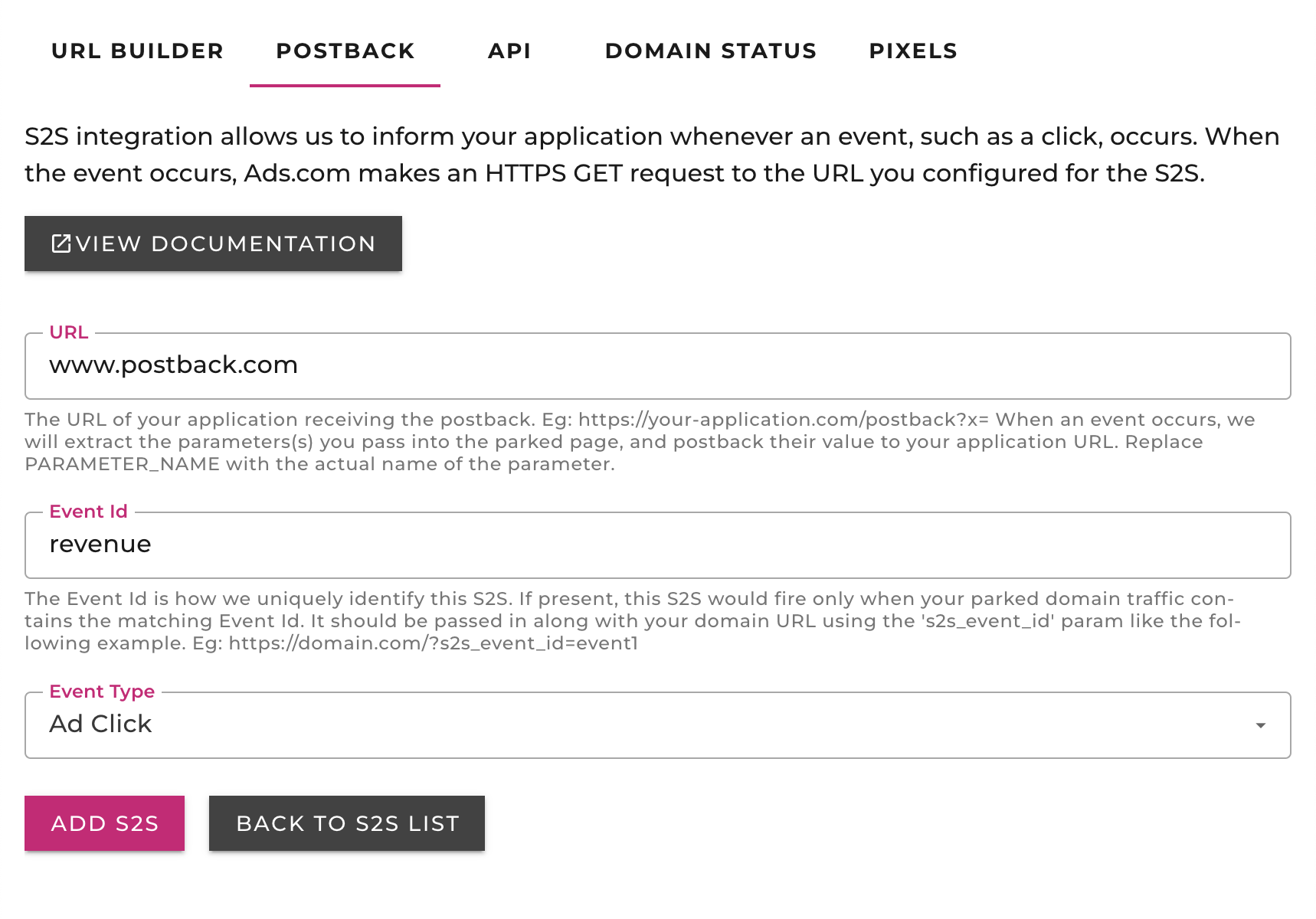 Once the S2S has been successfully created you will see the postback url, event Id, and event type added to the S2S list.